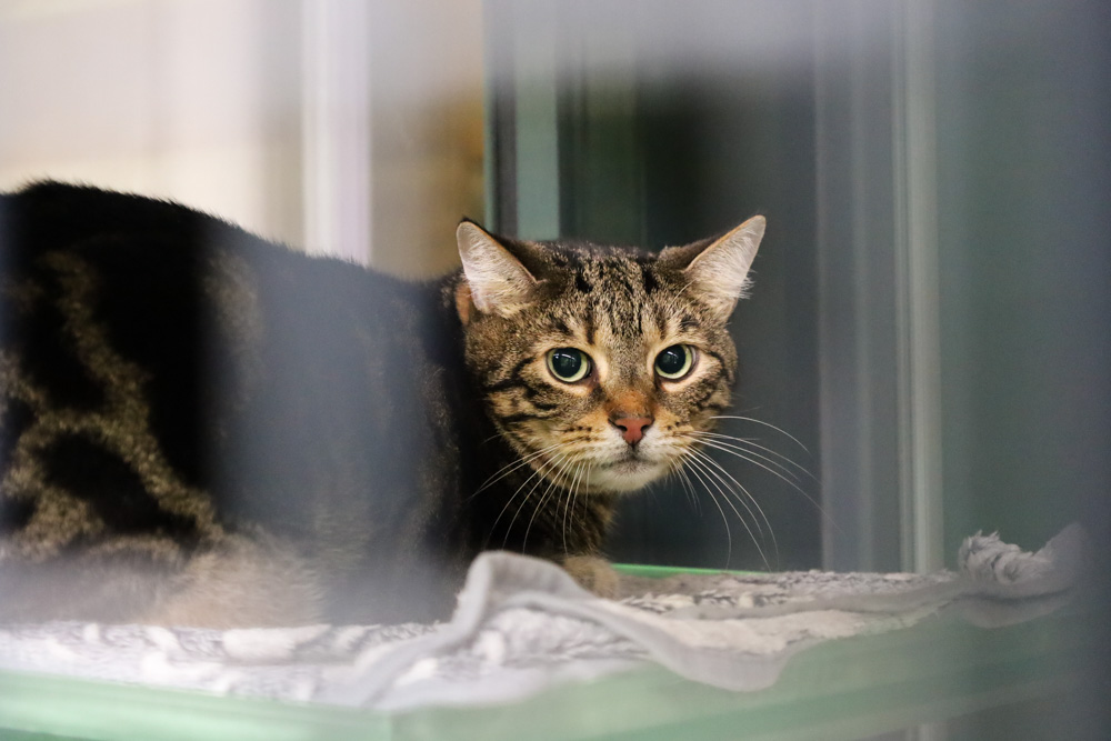 So liege ich nun – Tag ein, Tag aus – hier herum und bin überfordert von all den fremden Menschen, die hier täglich vorbei schlendern, und all die anderen Katzen, die laut herum miauen.